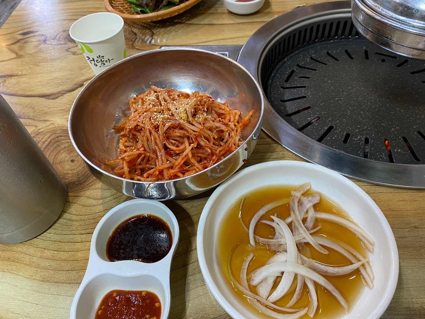 삼겹살 찍어 먹을 소스와 콩나물 무침, 양파절임이 나온다.