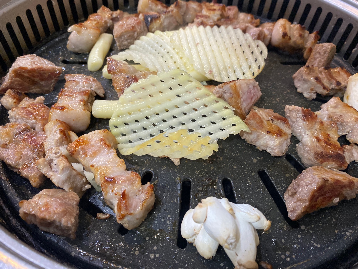 노릇노릇 맛있게 구워지고 감자랑 떡볶이, 버섯도 올려주신다.
