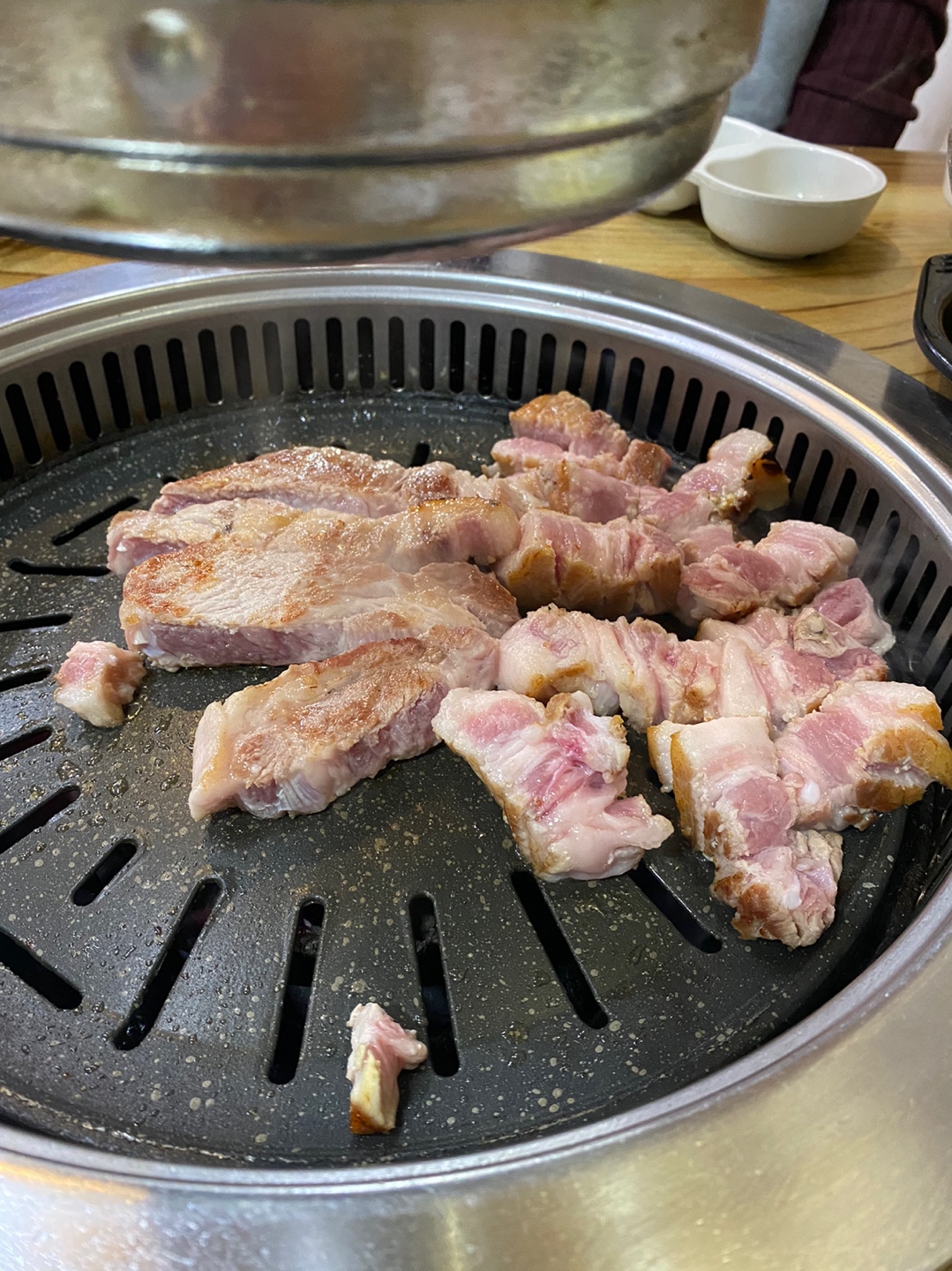 맛있게 익기를 기다리고 두툼삼겹살은 굽기가 중요한 만큼 사장님께서 잘 구워 주신다.